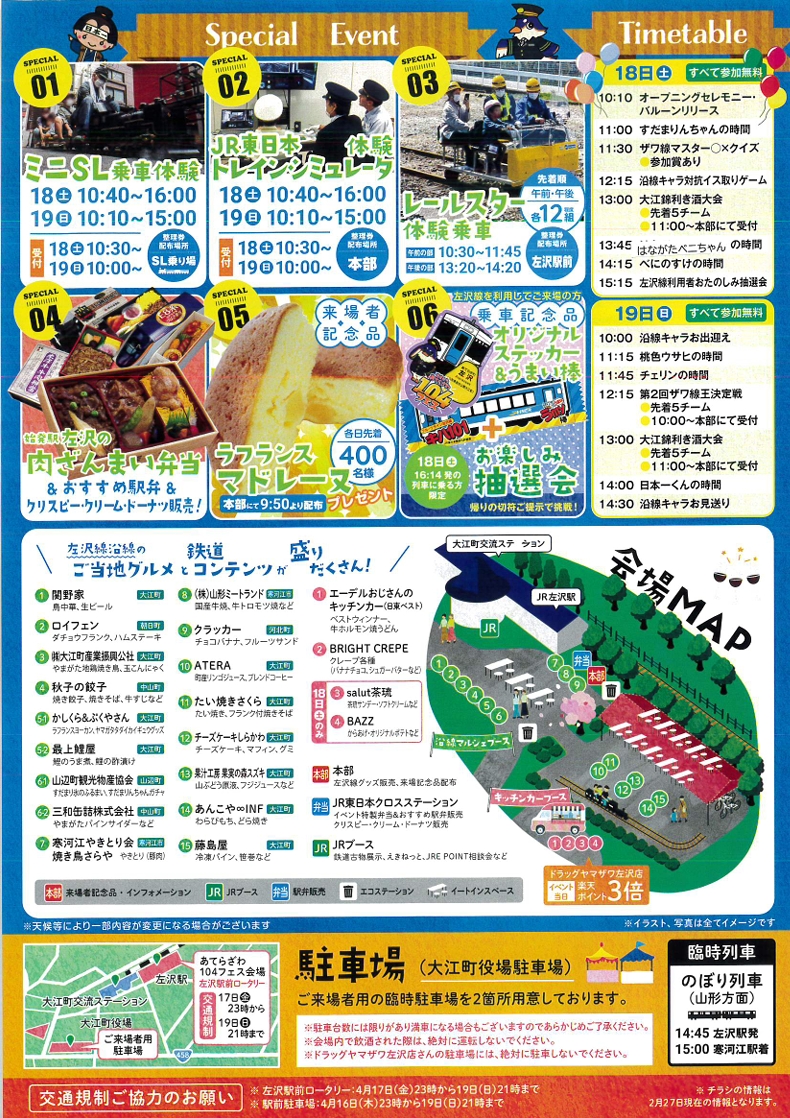 - お楽しみ抽選会:左沢線を利用してご来場の方へ、乗車記念のオリジナルステッカー&うまい棒をプレゼント。18日(土)16:14発の左沢線をご利用の方限定、お楽しみ抽選会を行います!