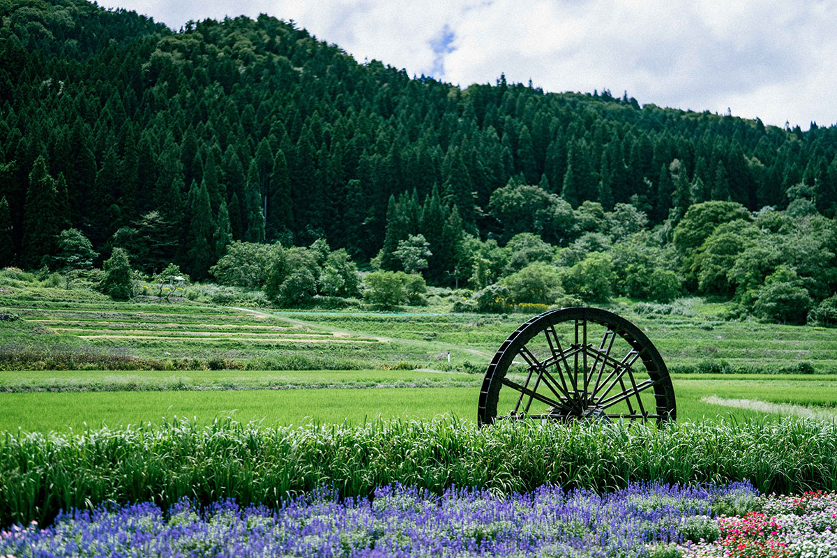 山林を抜けると棚田の田園風景が広がり、時が止まったかのような静寂な場所に水車が凜と佇んでいます。四季折々の景色、川のせせらぎとともに回る水車。その風景の中には「何もしない贅沢」があります。